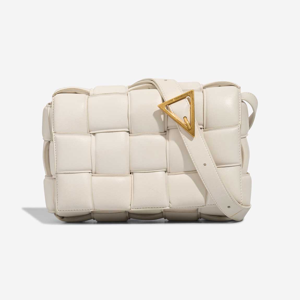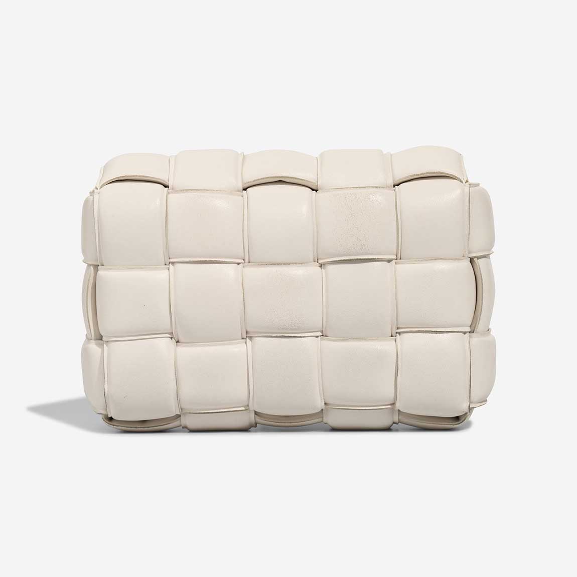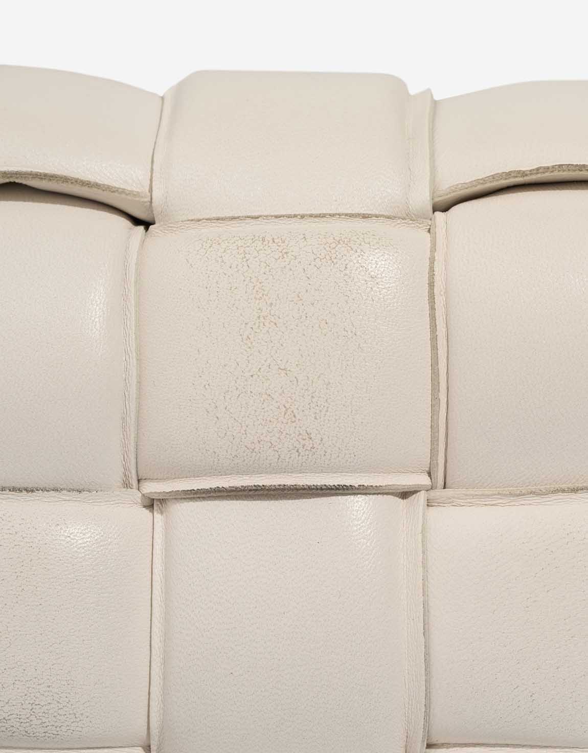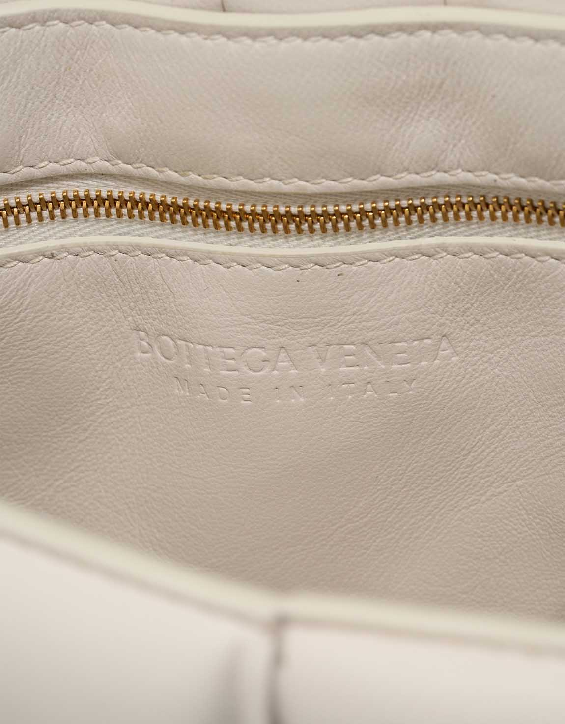 This Bottega Veneta Cassette is crafted from supple lambskin in crisp white, showcasing the label’s signature Intrecciato weave. Finished with gold-tone hardware, its bold geometry makes a statement in any wardrobe. A sleek yet practical design, ideal for modern dressing, it arrives in very good pre-loved condition, made in 2022.