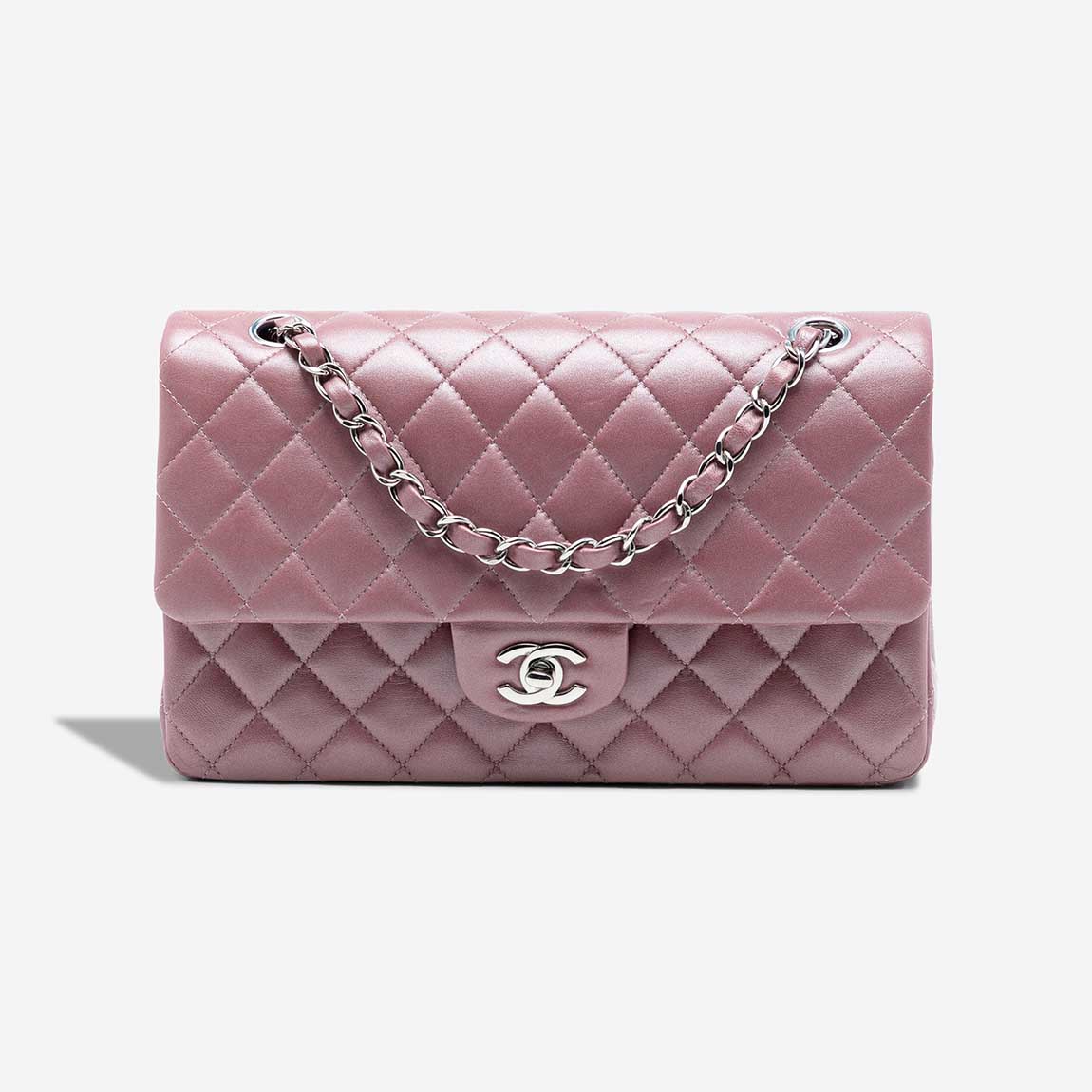 This Chanel Timeless Medium Double Flap is crafted from metallic rose gold lambskin, lending luminous depth to the house’s most iconic silhouette. Silver-tone hardware and the signature CC clasp create a refined contrast against the radiant finish. Produced between 2017 and 2018, it balances statement appeal with timeless elegance. The bag arrives in excellent pre-loved condition.