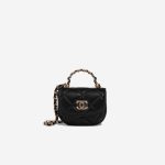 A Chanel Timeless Micro Handle, crafted in a delicate black lambskin topped with pale gold-tone hardware. This dainty micro bag is a special gift from Chanel's house to its exclusive customers. Its top curved handle is detailed with white pearls and leather, and its front flap showcases the iconic CC logo. Made in 2022, it has never been worn.