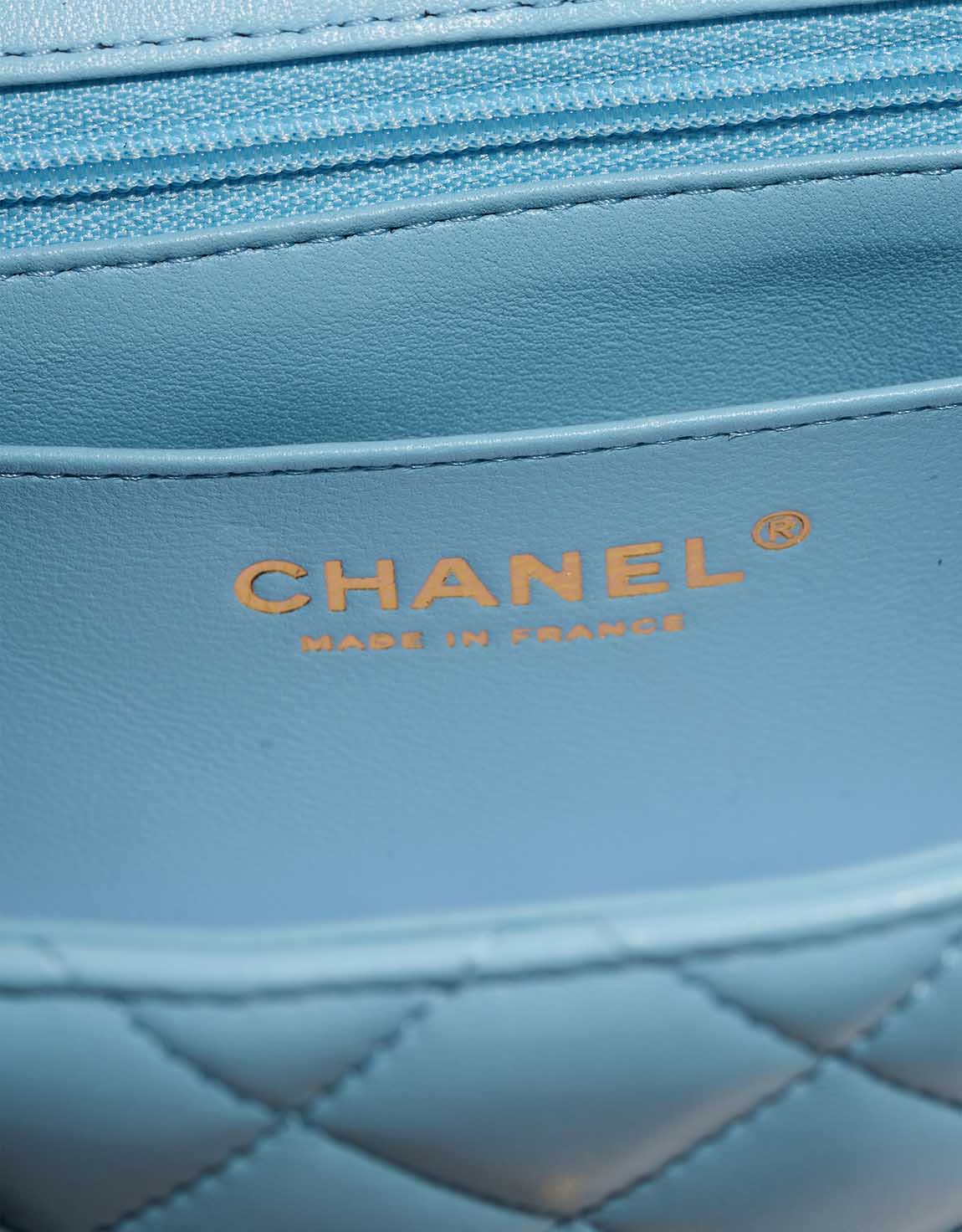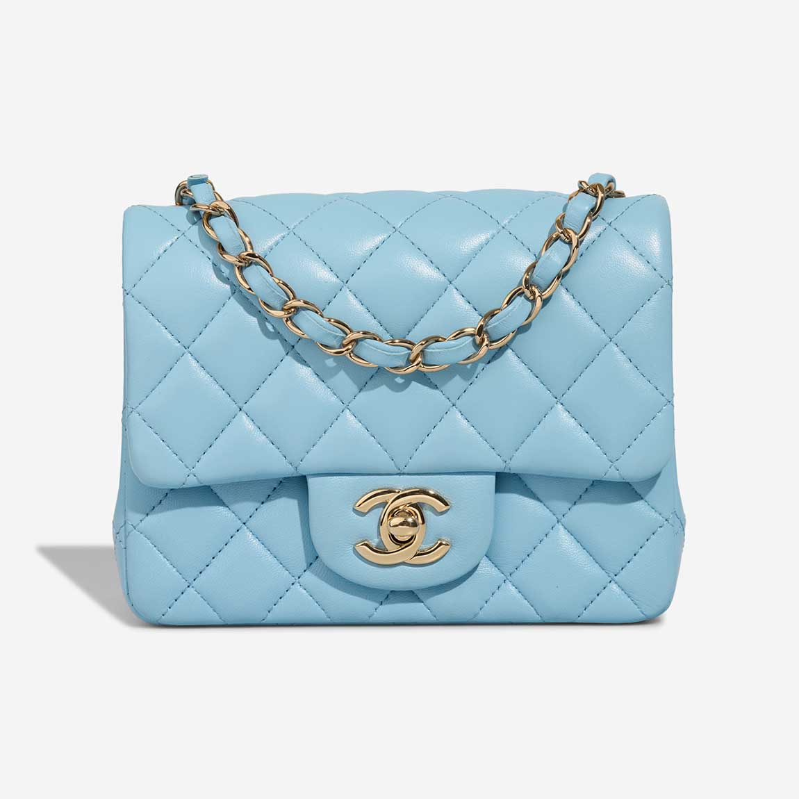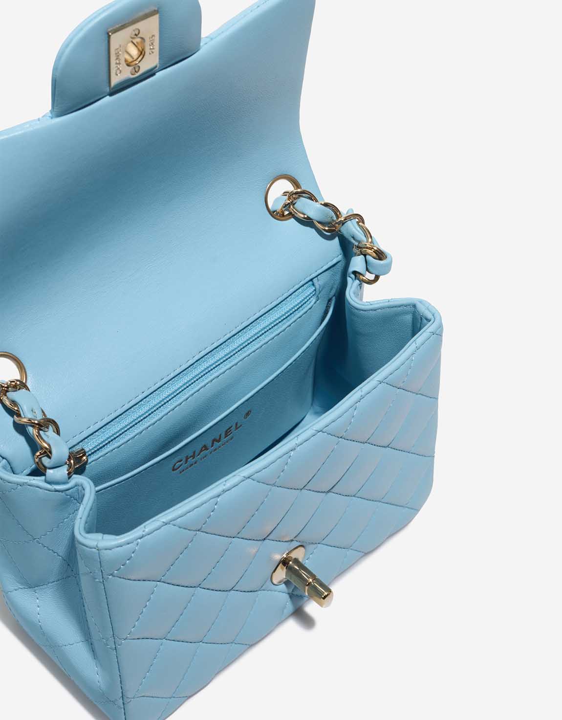 This Chanel Timeless Mini Square with top handle brings a contemporary twist to a house classic. Crafted in blue lambskin with light gold hardware, it balances playful elegance with everyday function. The bag arrives in like-unworn condition.