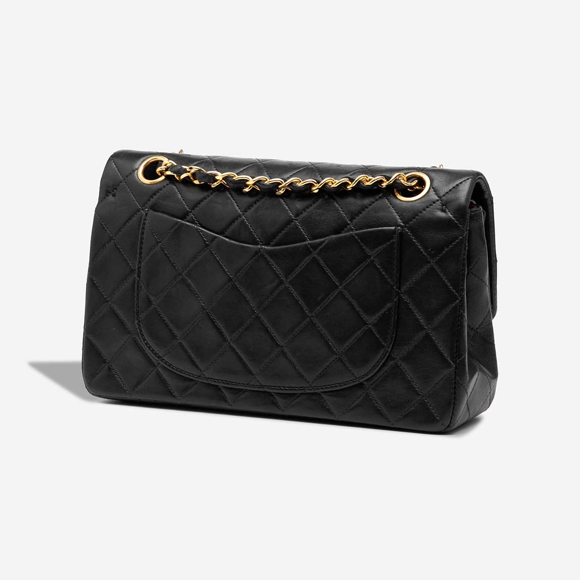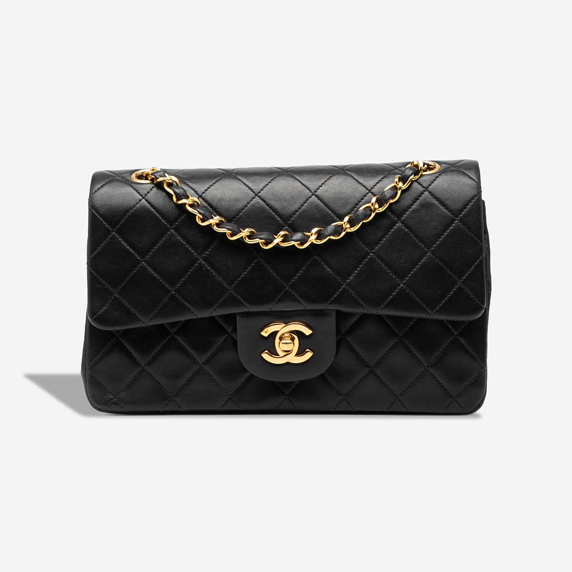 This vintage Chanel Timeless Small Double Flap is crafted from soft black lambskin with gold-plated hardware and the signature CC turn-lock. A collector’s piece from 1991–1994, it features a structured silhouette and classic double flap closure. The chain strap includes a professional leather repair. The bag arrives in excellent pre-loved condition.