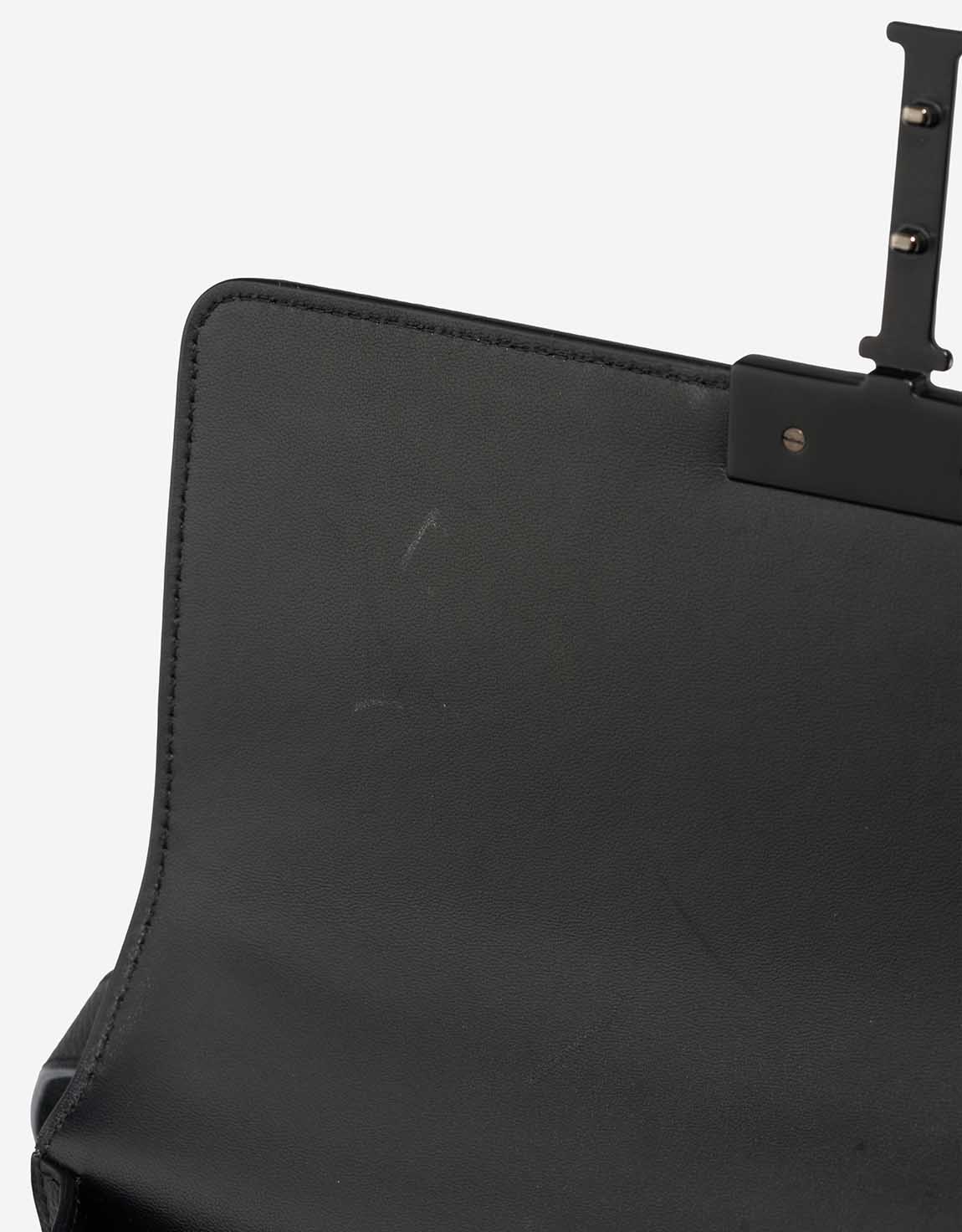 The leather shows scratches and signs of wear mainly inside; the closing clasp hardware is slightly scratched.