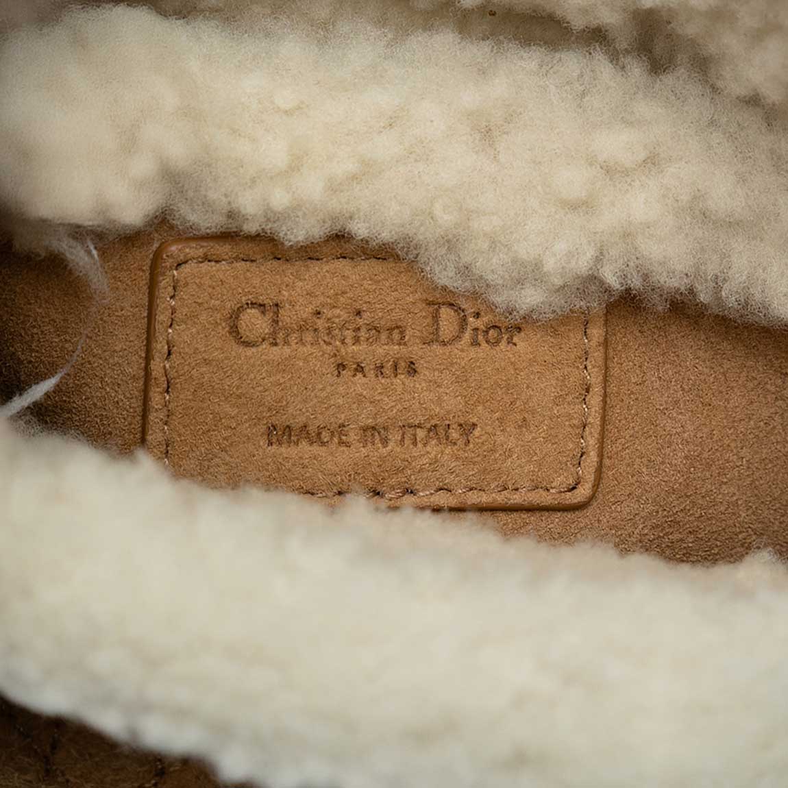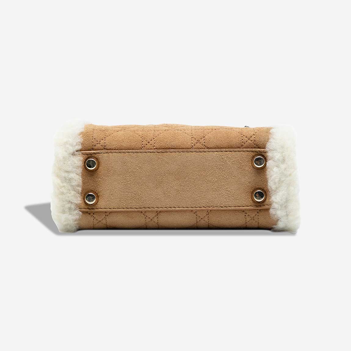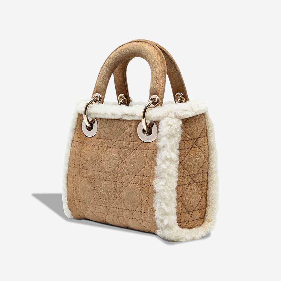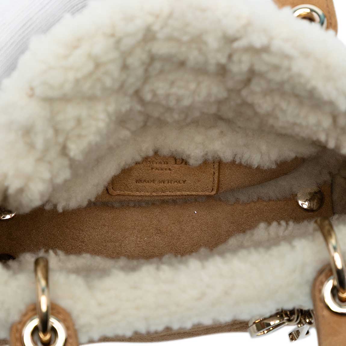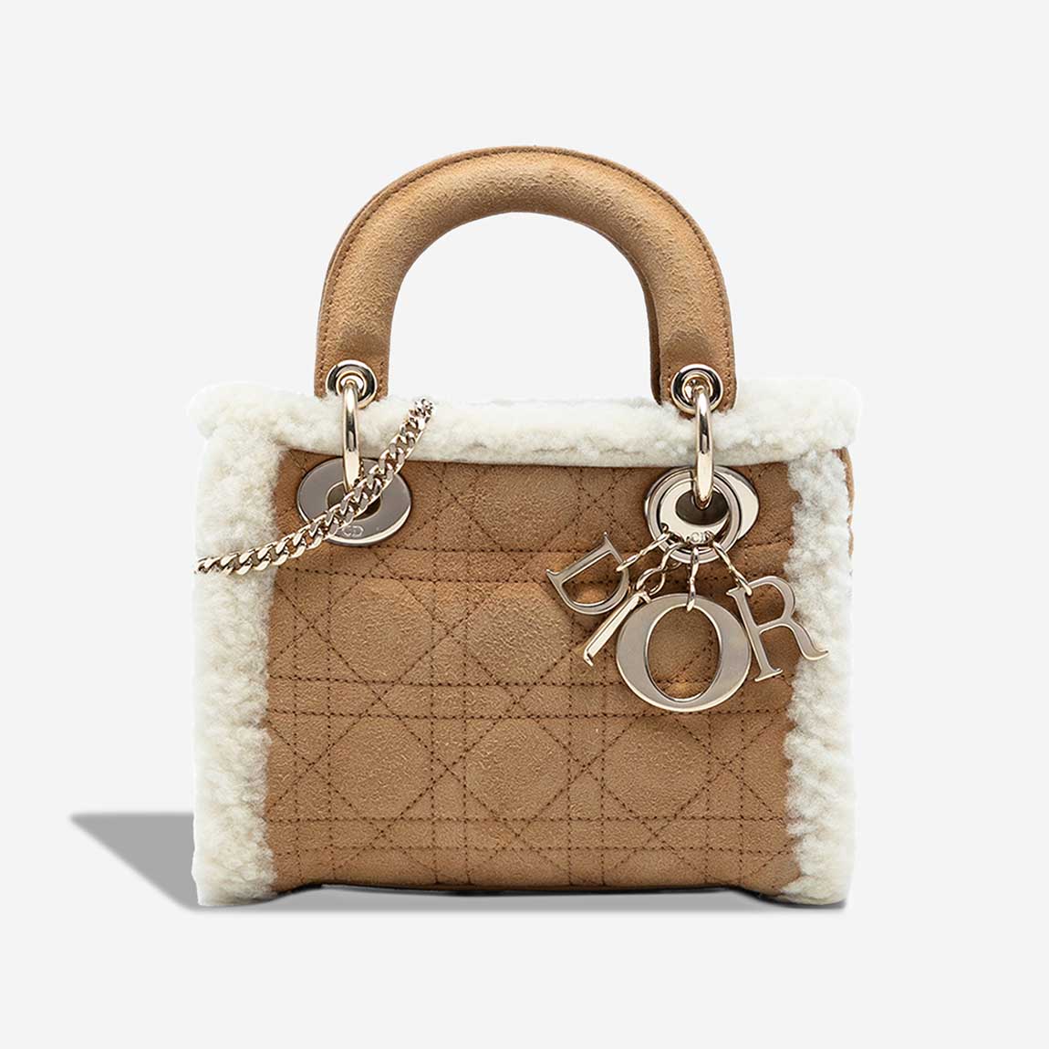 This Dior Mini Lady Dior is crafted from soft brown suede, embroidered with the Cannage motif and trimmed with white shearling. The pale gold hardware adds warmth to its winter-ready aesthetic. Crafted in 2020, it arrives in a good pre-loved condition.