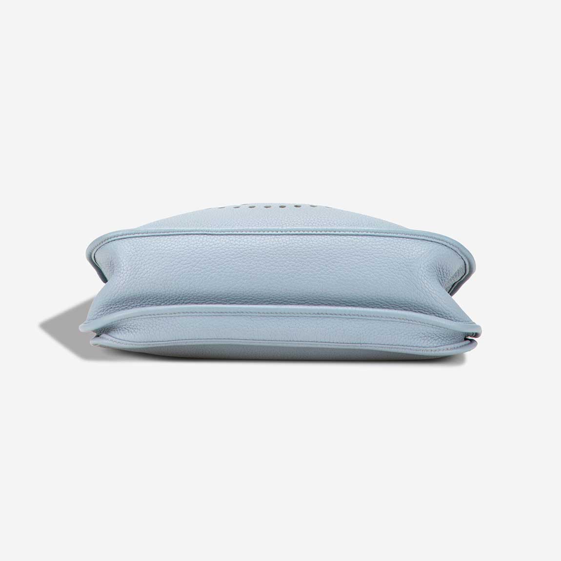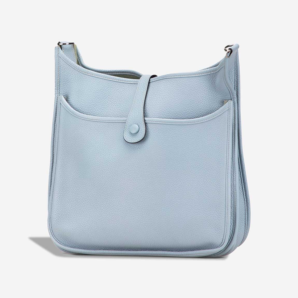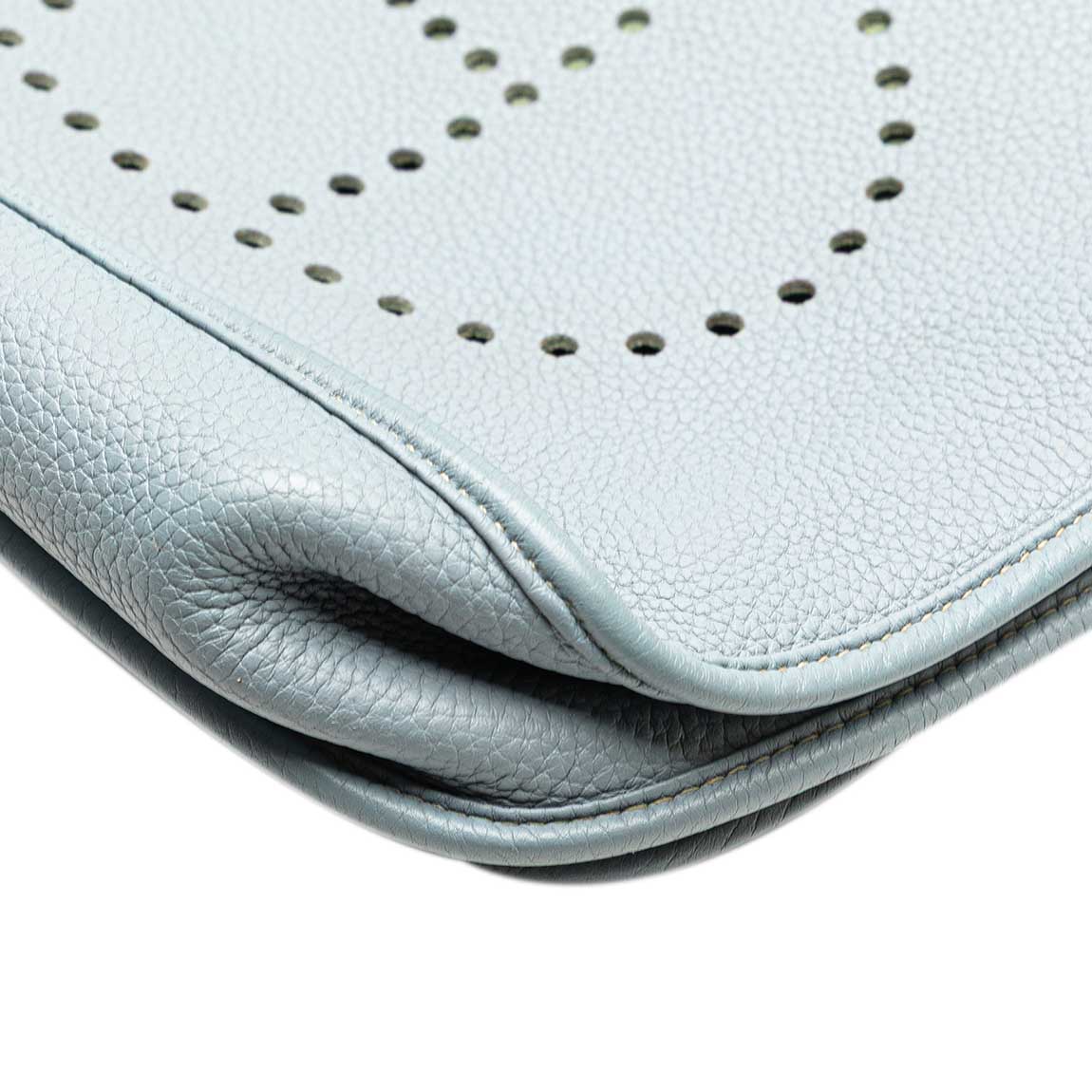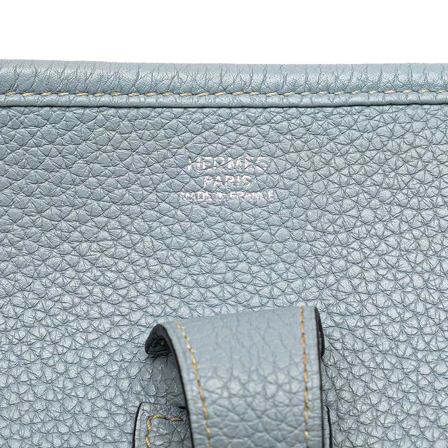 This Evelyne 33 is crafted in soft Taurillon Clémence leather in Bleu Lin — a delicate pale blue with a hint of grey. Featuring palladium hardware and the iconic perforated “H” on the front, the bag offers relaxed elegance in a spacious, everyday silhouette. Handcrafted in 2013 (“Q” stamp), it arrives in excellent pre-loved condition.