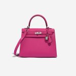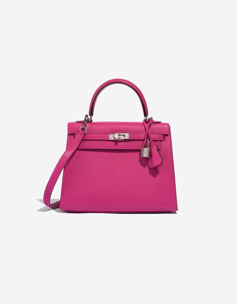 An Hermès Kelly 25 crafted from Epsom leather in Rose Pourpre, a pop-bright shade perfectly suited for summer. Match your jewellery to the palladium hardware and attach the shoulder strap to go hands-free. The Kelly bag arrives in excellent condition, showing only small signs of wear on the hardware and metal feet, together with a subtle stain on the top near the handle. Leave the clasp undone for easy access and a more casual look.