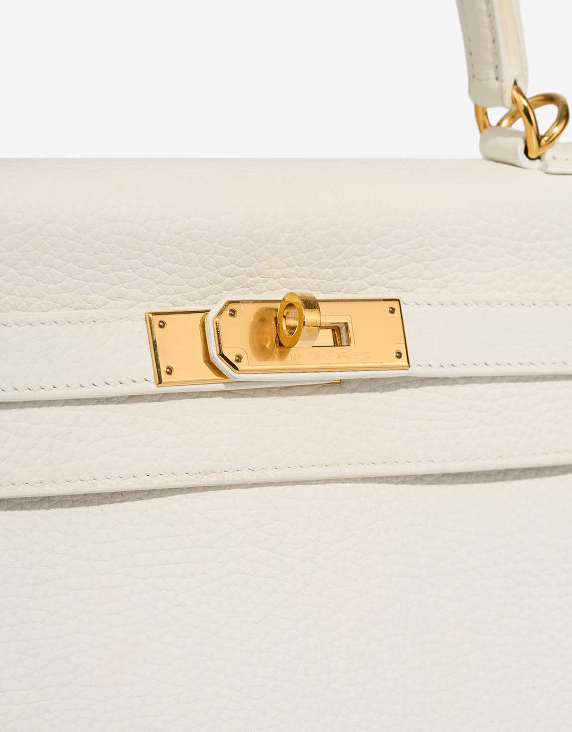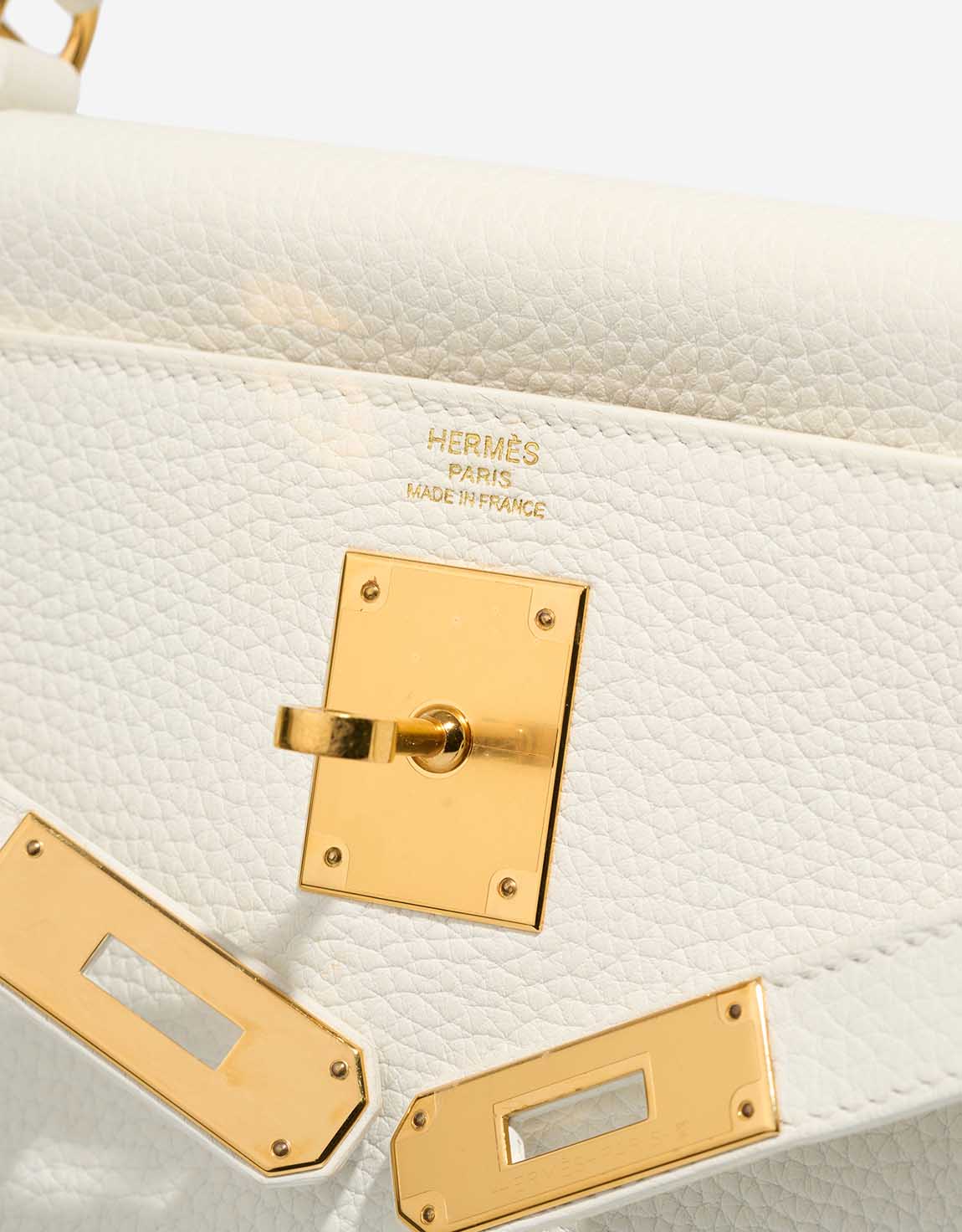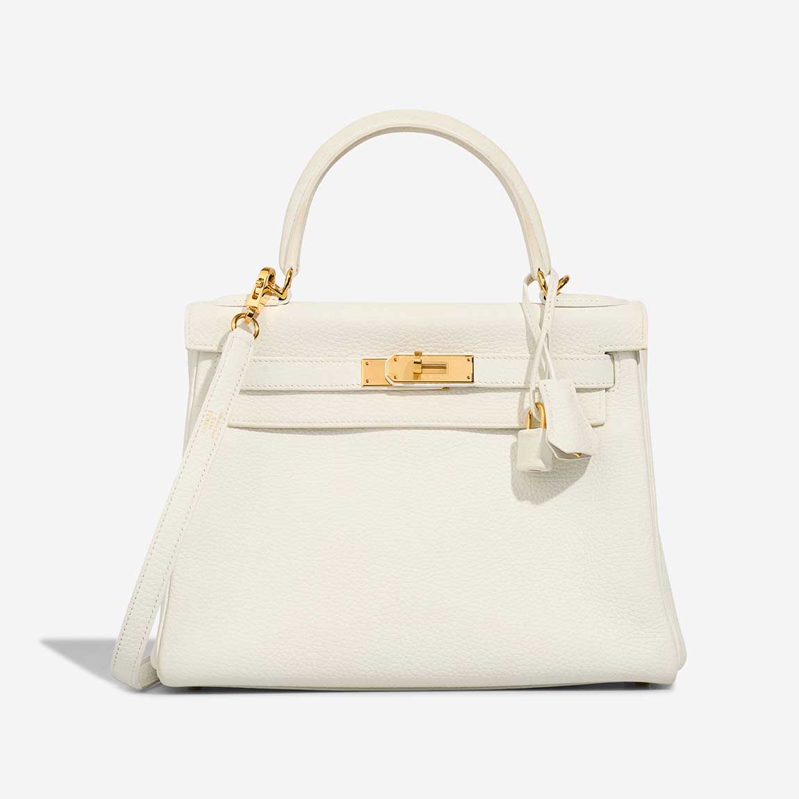 This Hermès Kelly 28 is rendered in soft Taurillon Clémence leather in New White — a fresh and luminous neutral. Featuring gold-plated hardware and a Retourne construction, it combines relaxed structure with timeless appeal. Crafted in 2023 (“B” stamp), the bag arrives in excellent pre-loved condition.