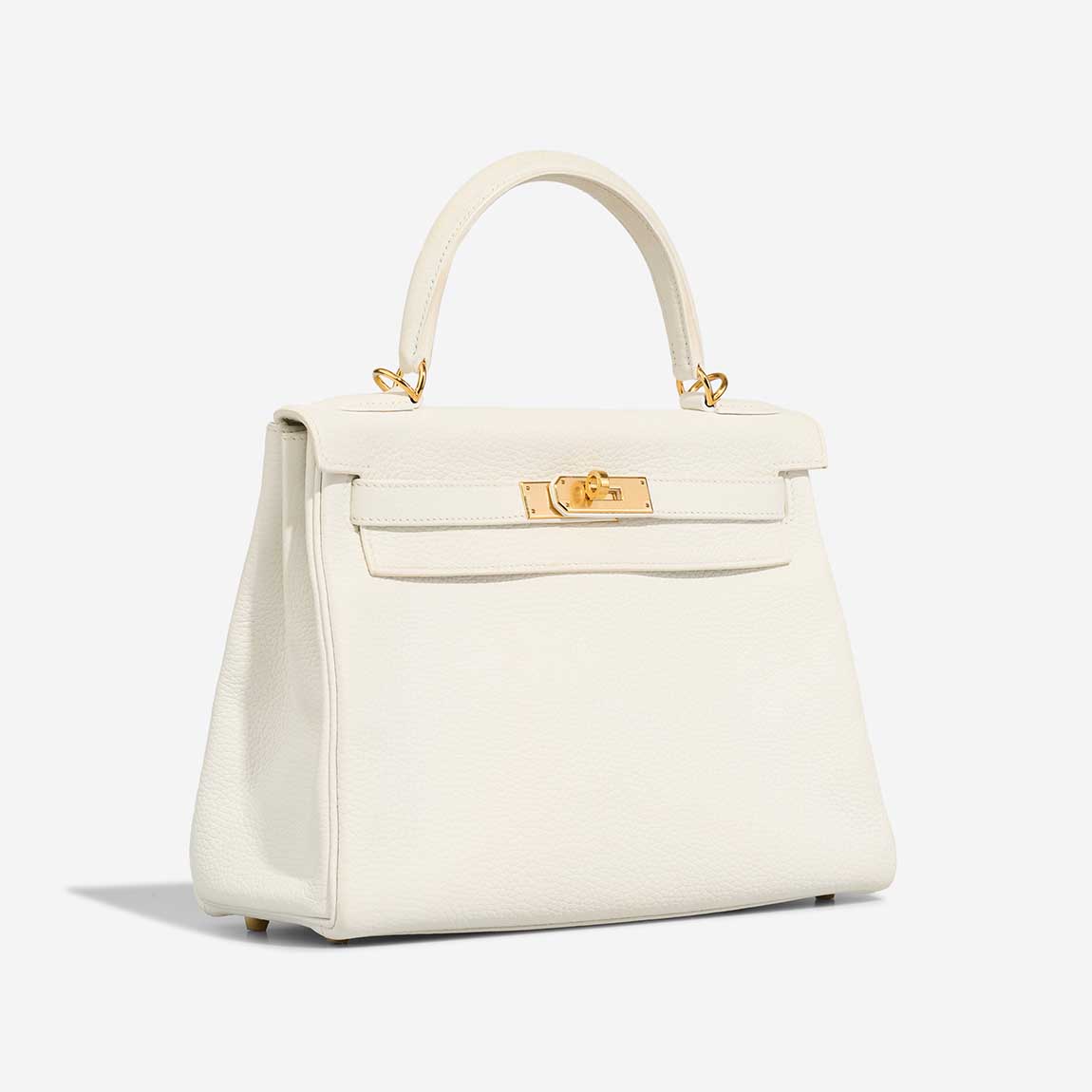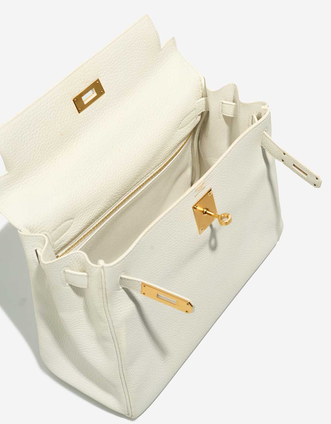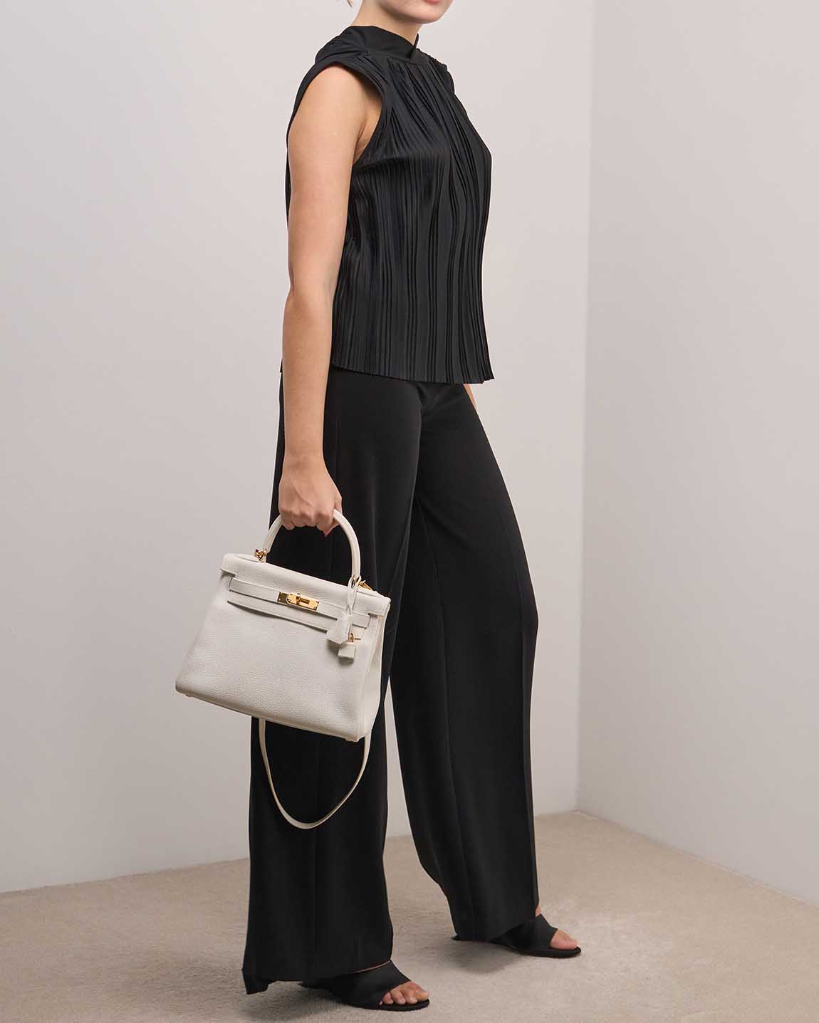 This Hermès Kelly 28 is rendered in soft Taurillon Clémence leather in New White — a fresh and luminous neutral. Featuring gold-plated hardware and a Retourne construction, it combines relaxed structure with timeless appeal. Crafted in 2023 (“B” stamp), the bag arrives in excellent pre-loved condition.