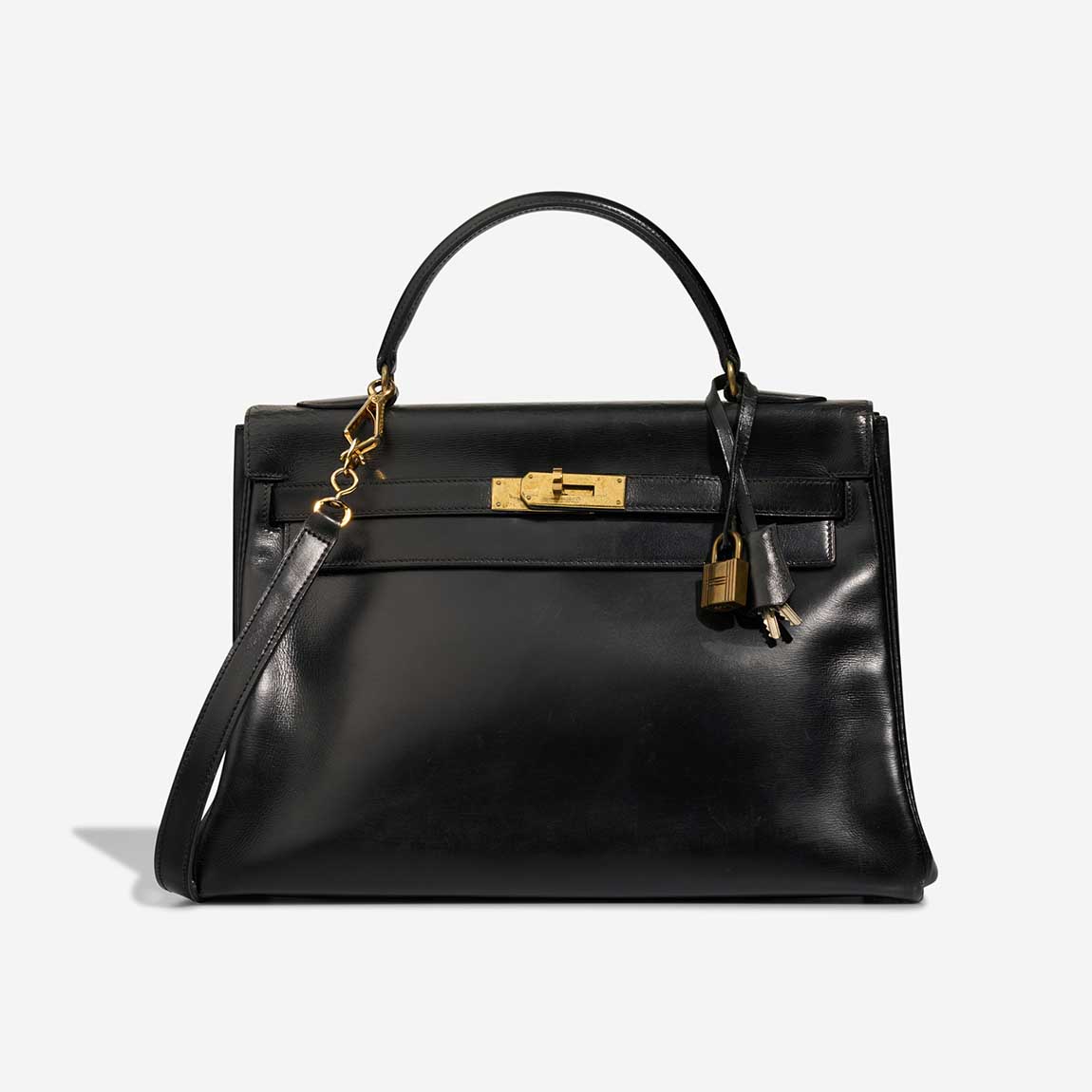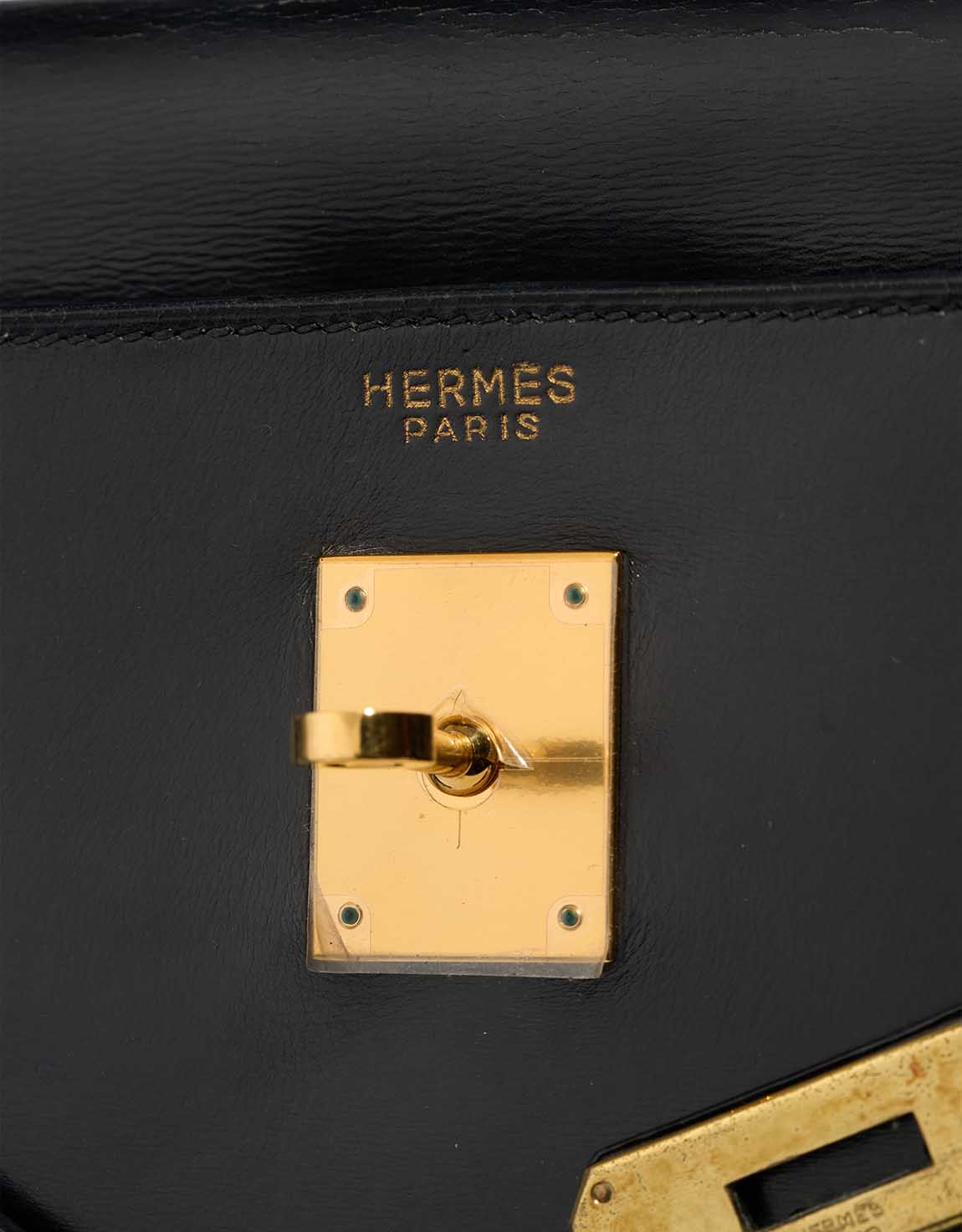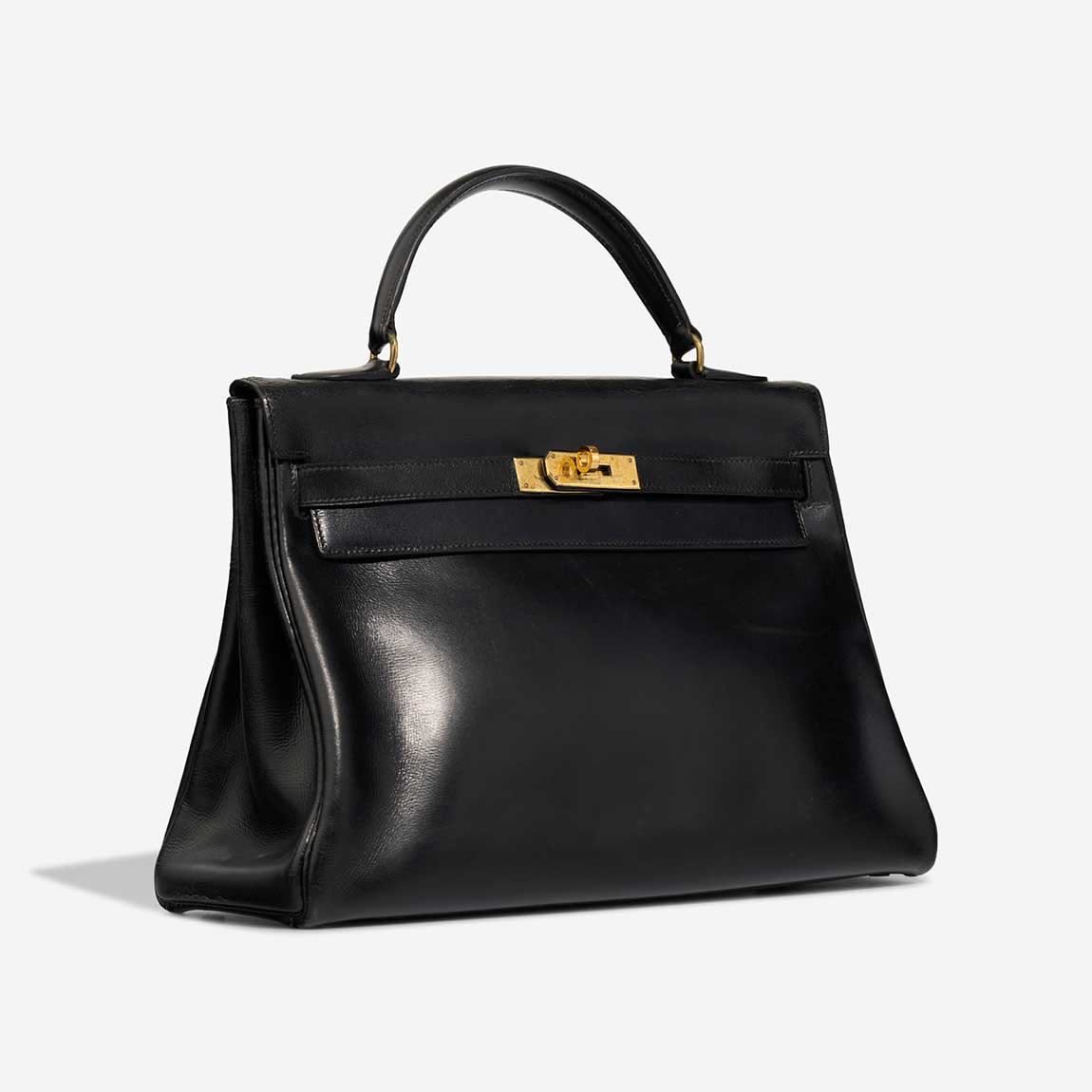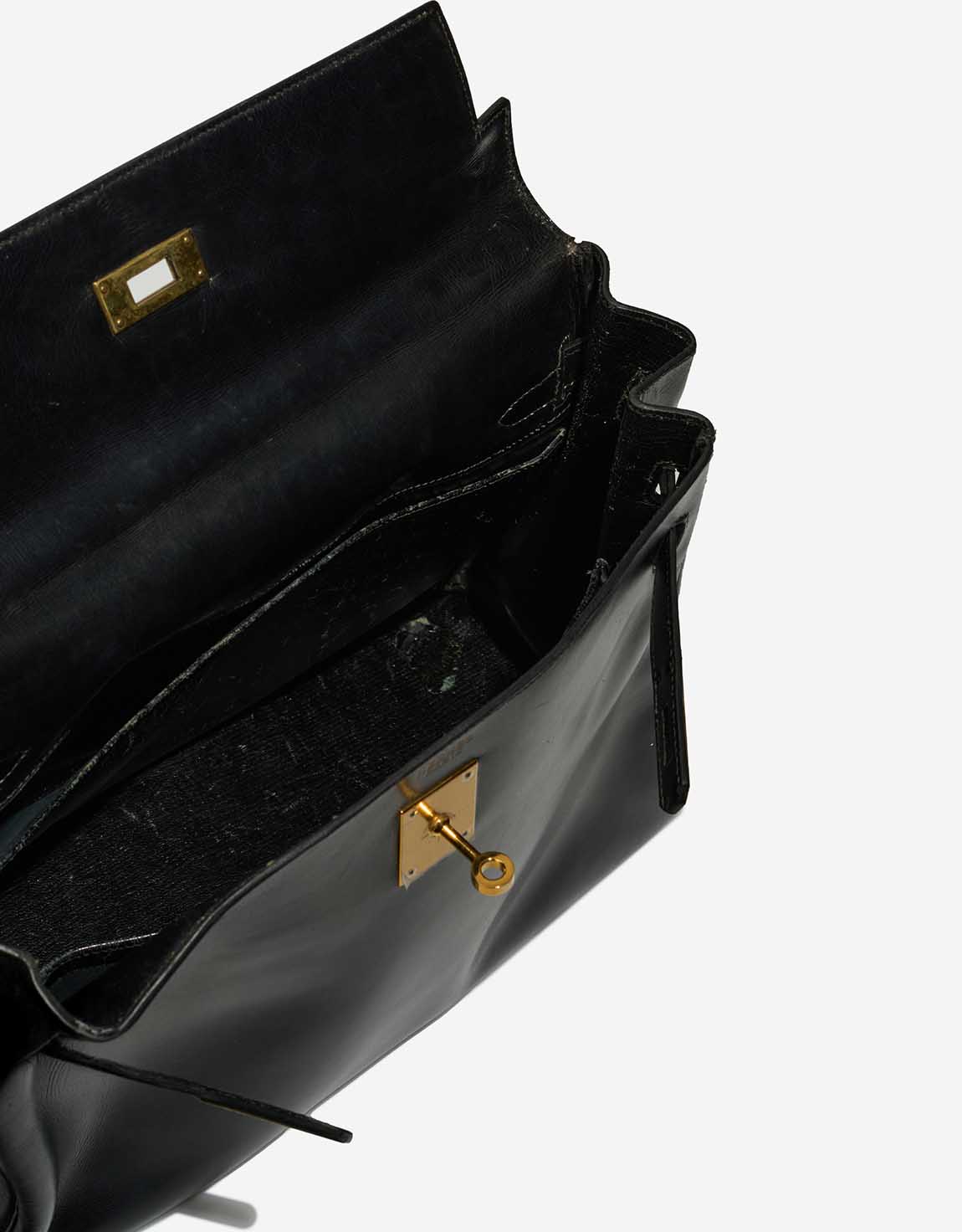 A remarkable vintage piece, this Kelly 32 was handcrafted in 1956 (“L” stamp) in glossy black Box leather. Time has added character — the bag shows patina and has undergone recolouring and spa treatment, with a replaced hardware plaque. It remains a collectable icon in good pre-loved condition.