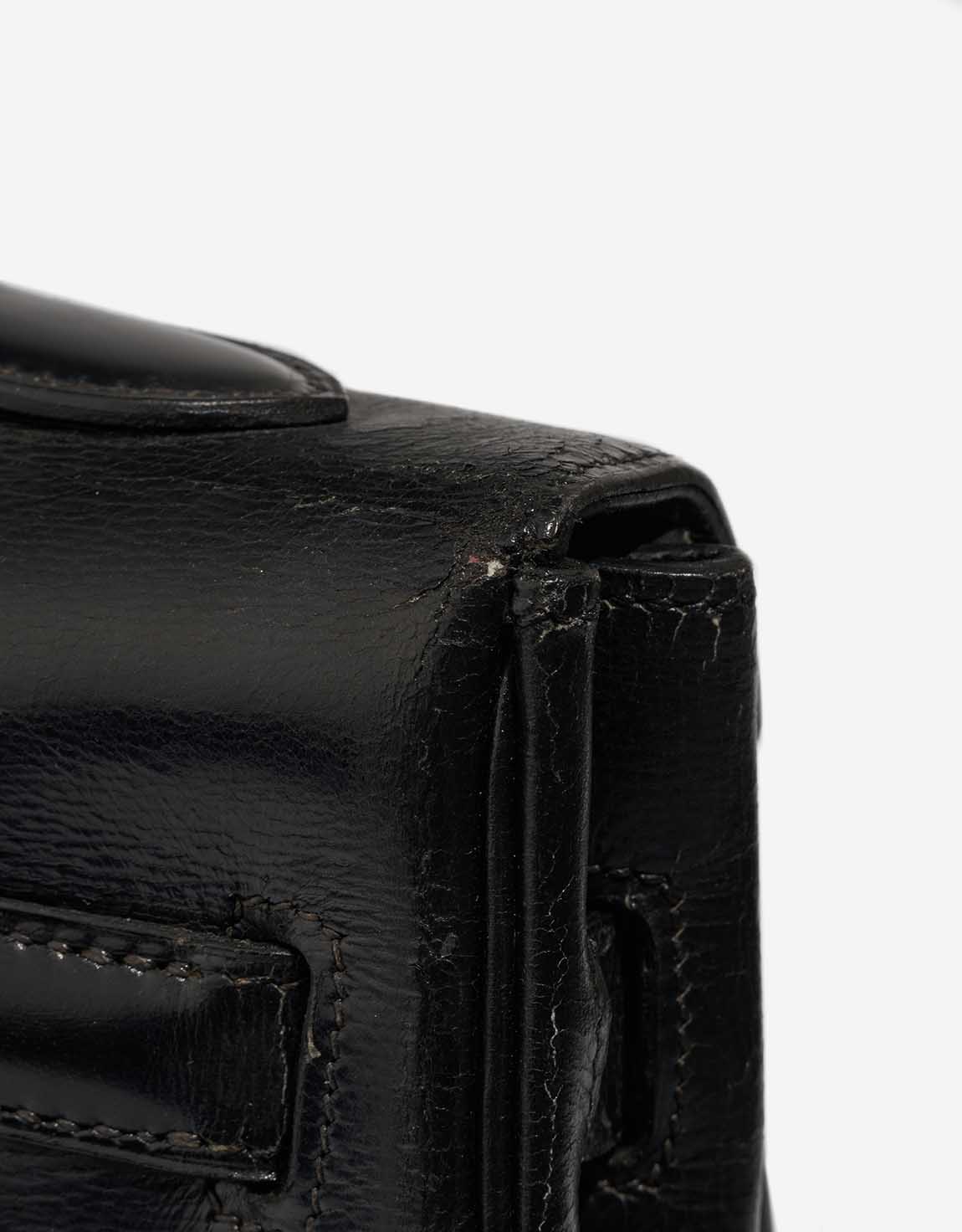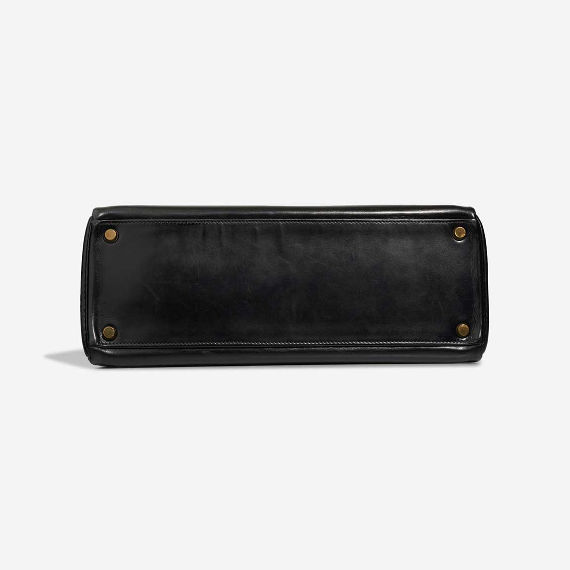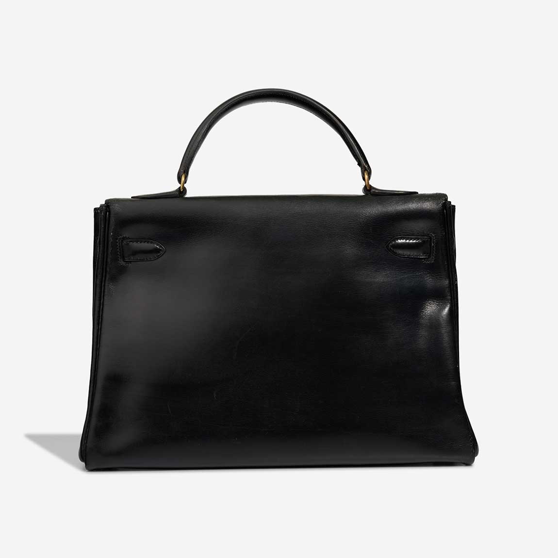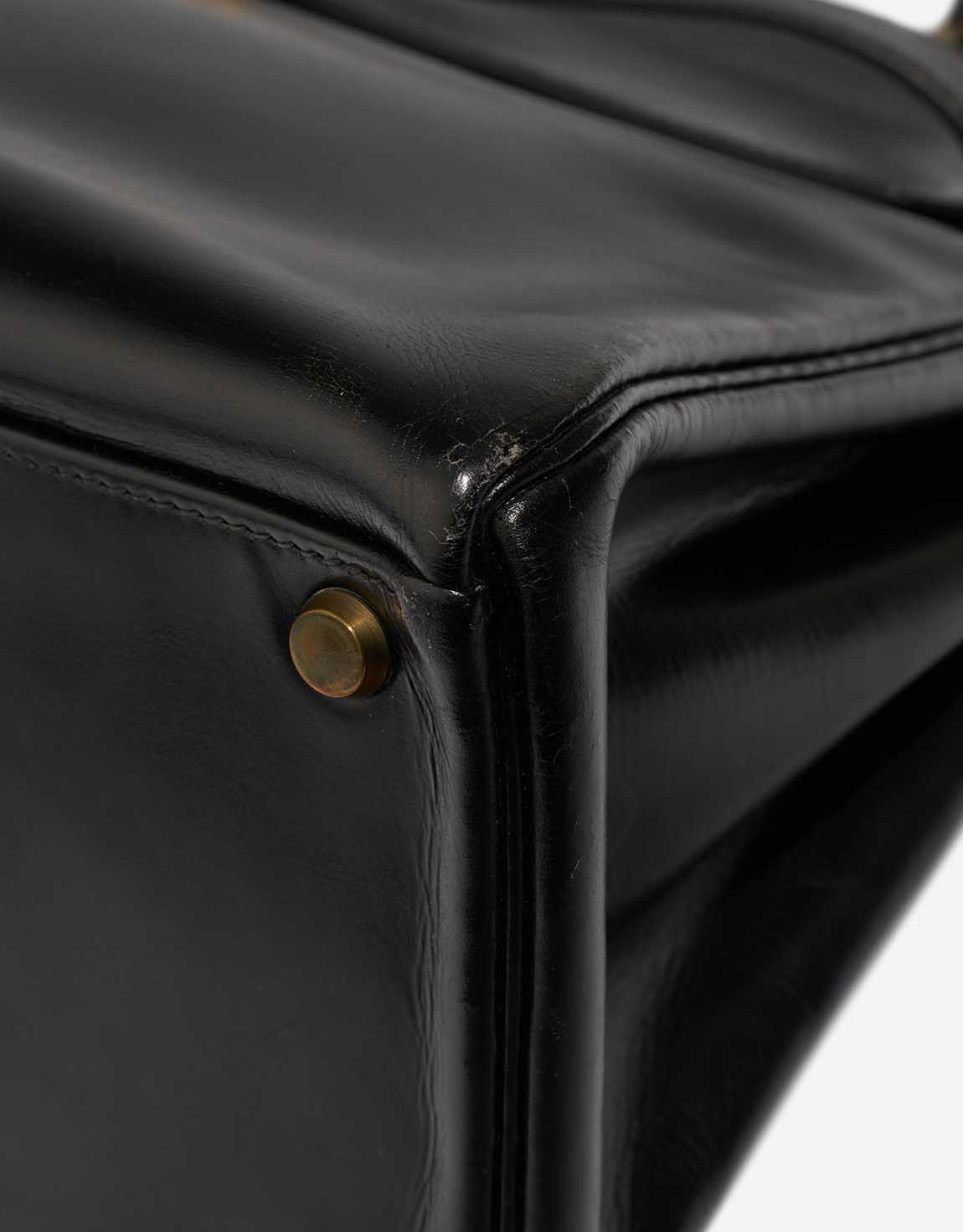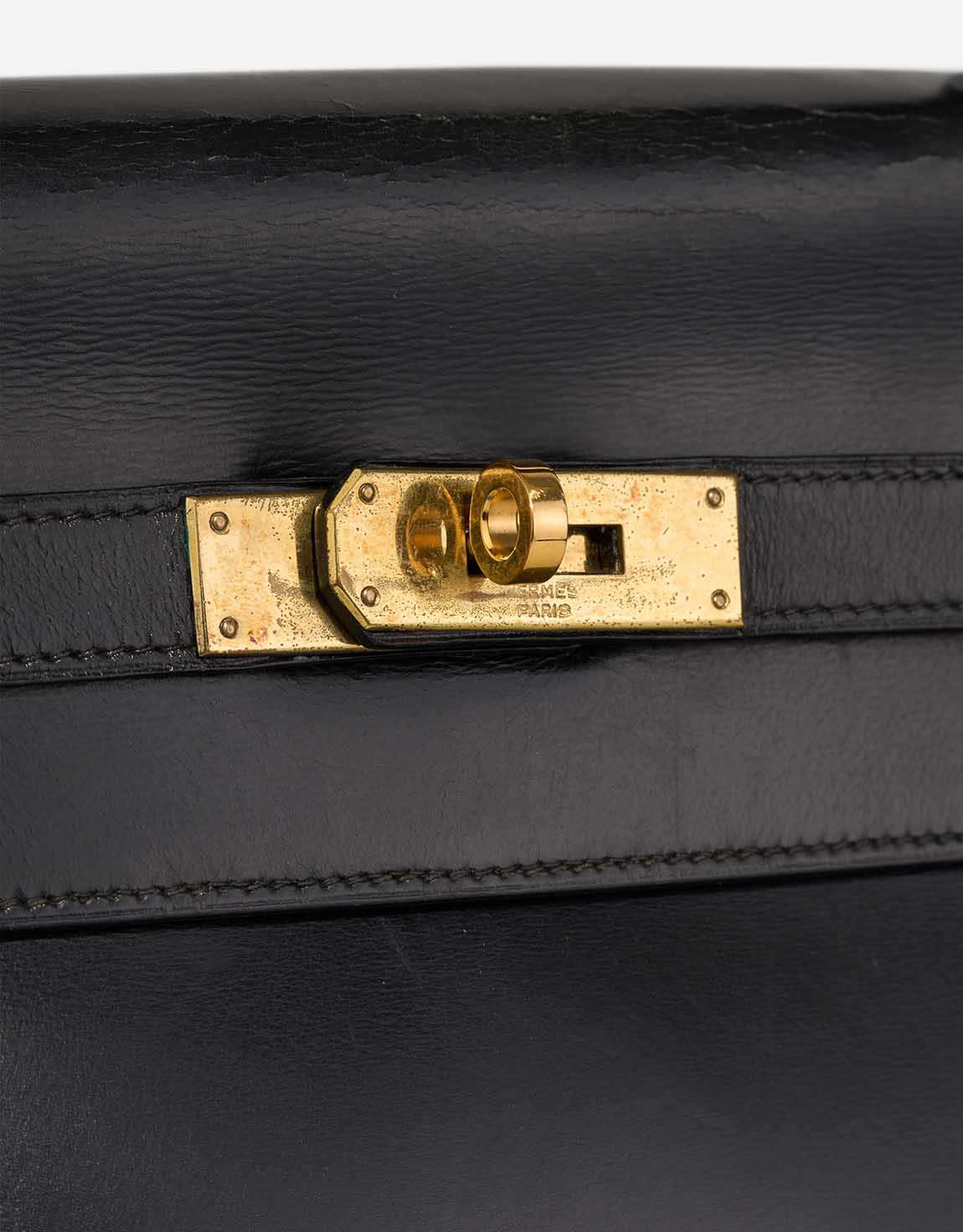 A remarkable vintage piece, this Kelly 32 was handcrafted in 1956 (“L” stamp) in glossy black Box leather. Time has added character — the bag shows patina and has undergone recolouring and spa treatment, with a replaced hardware plaque. It remains a collectable icon in good pre-loved condition.