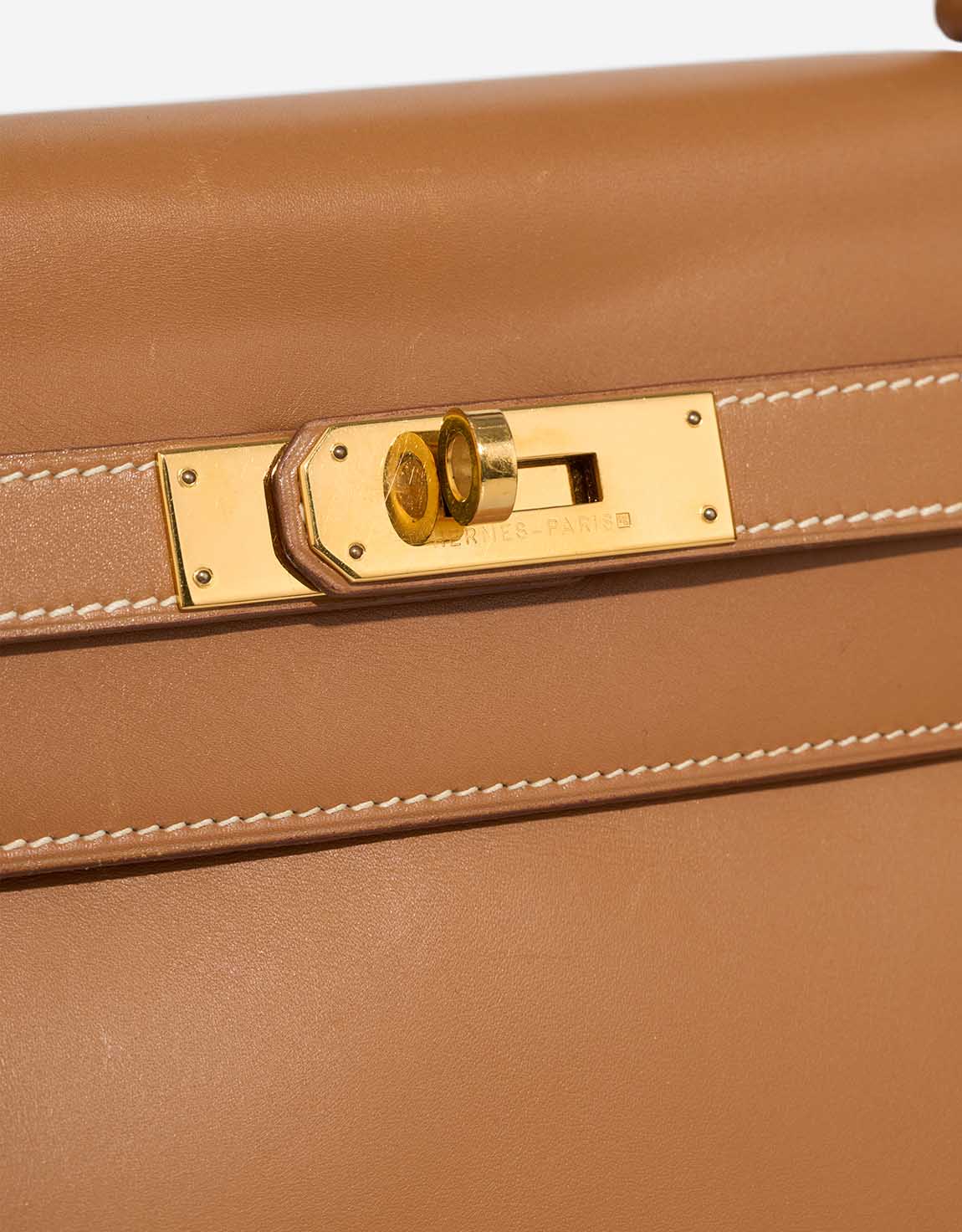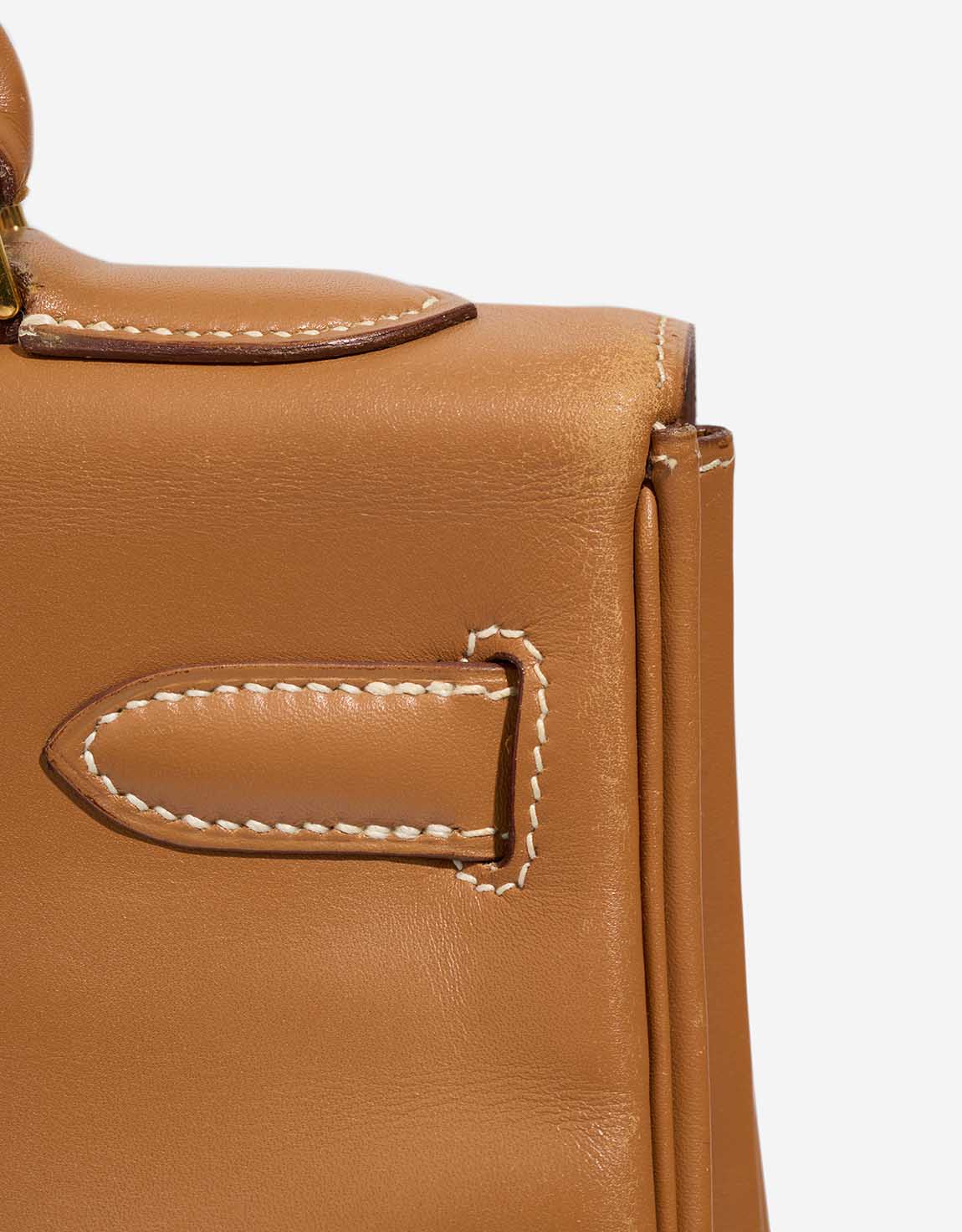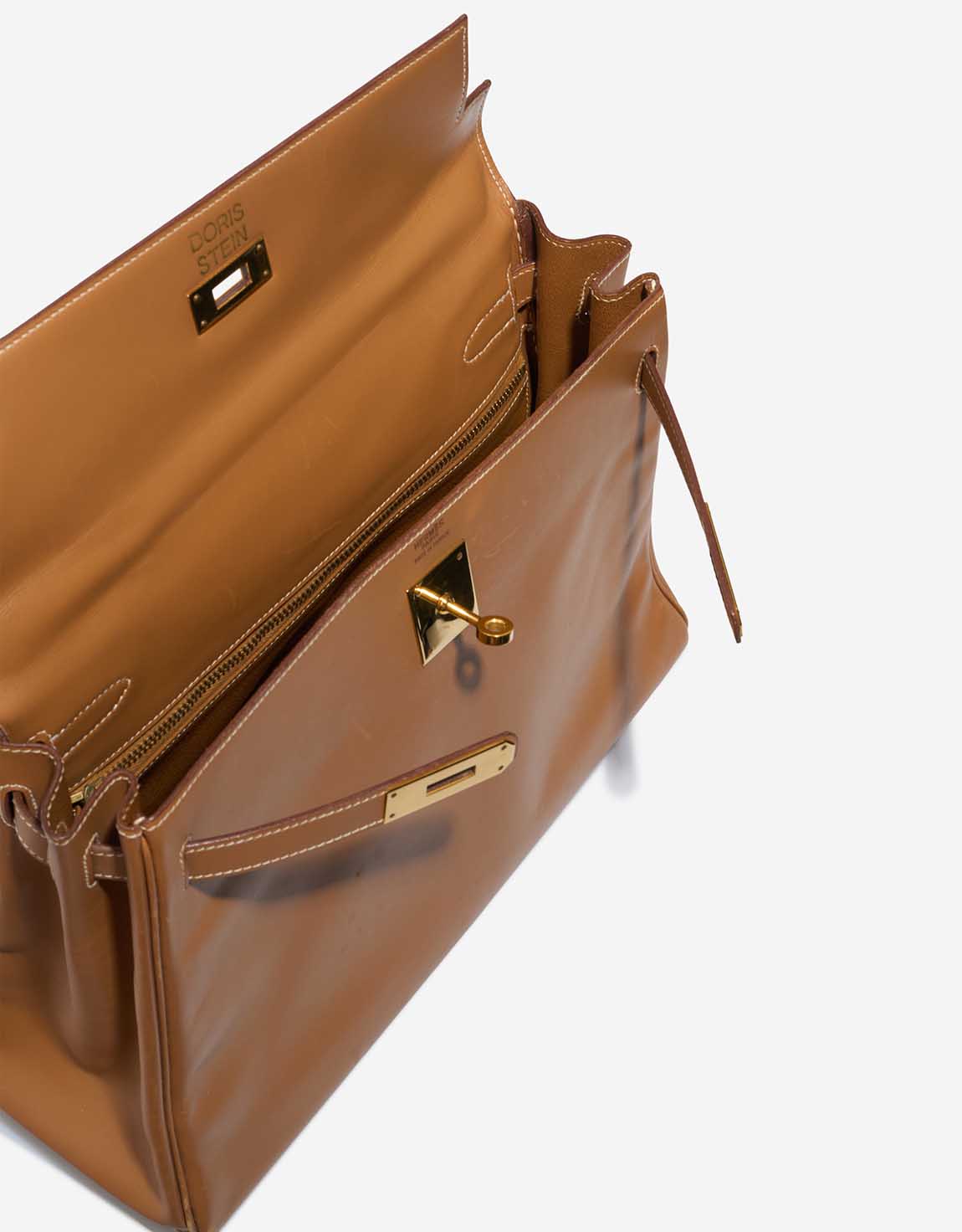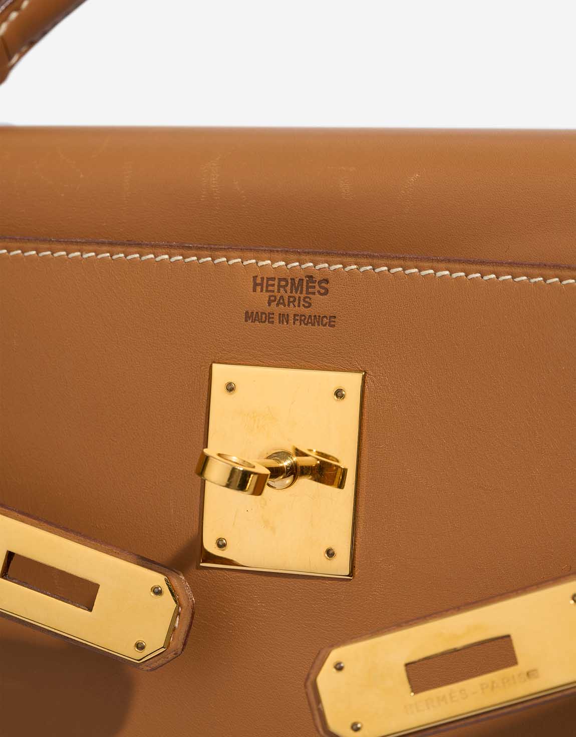 Signs of wear in the corners, scratches on the hardware, stains and scratches on the leather, branded name stamped under the flap.