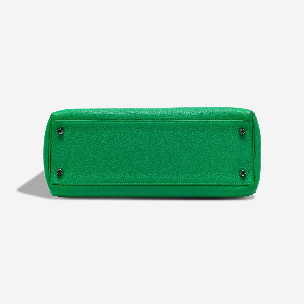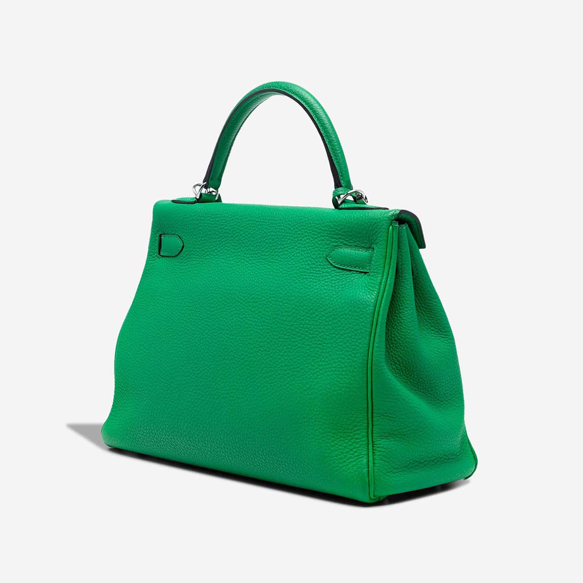 Hermès brings vivid colour to its timeless craftsmanship with this Kelly Retourne 32 in Togo leather. The vibrant green shade, Bambou, is paired with palladium hardware for a contemporary finish. Handcrafted in 2013 (“Q” stamp), this piece is in excellent pre-loved condition.