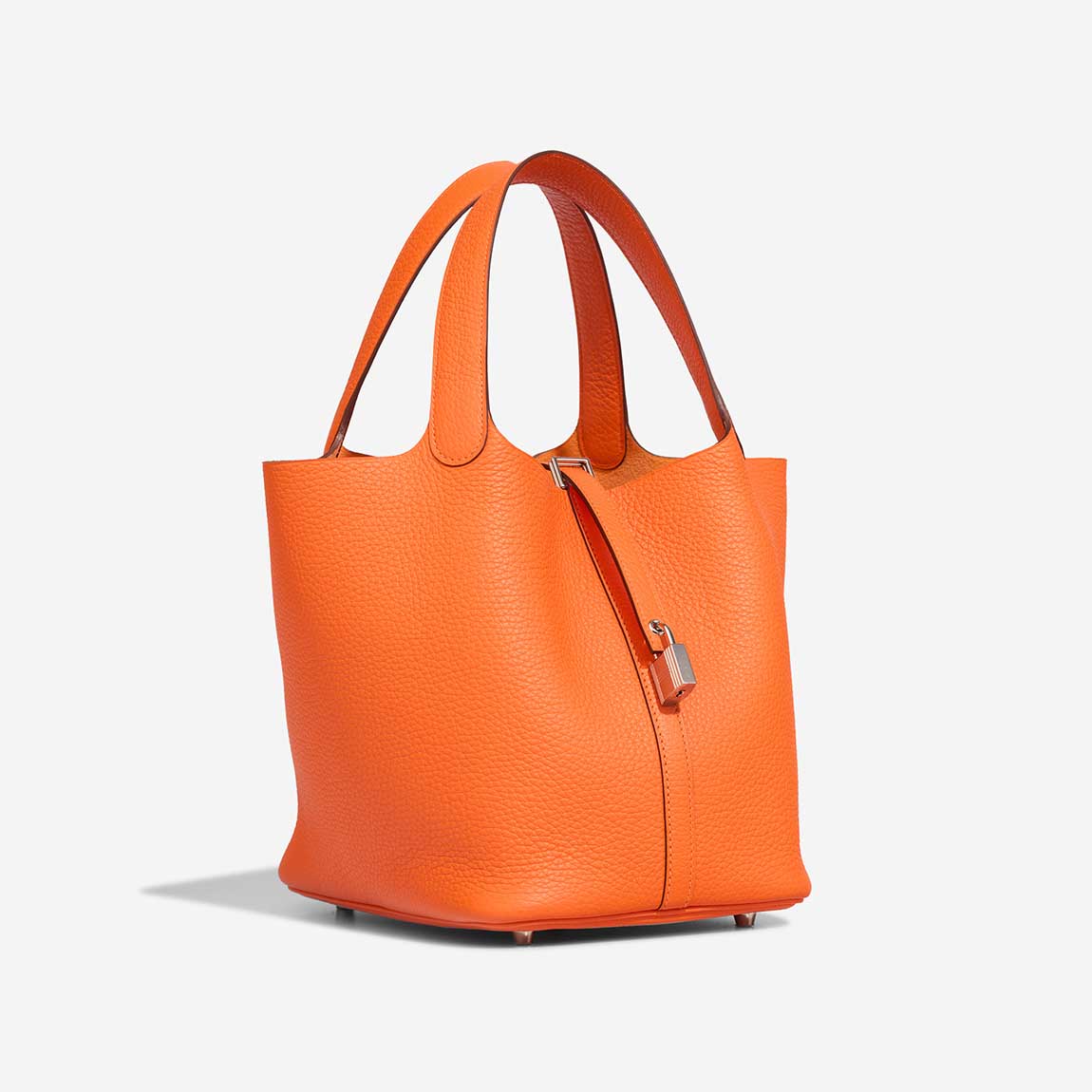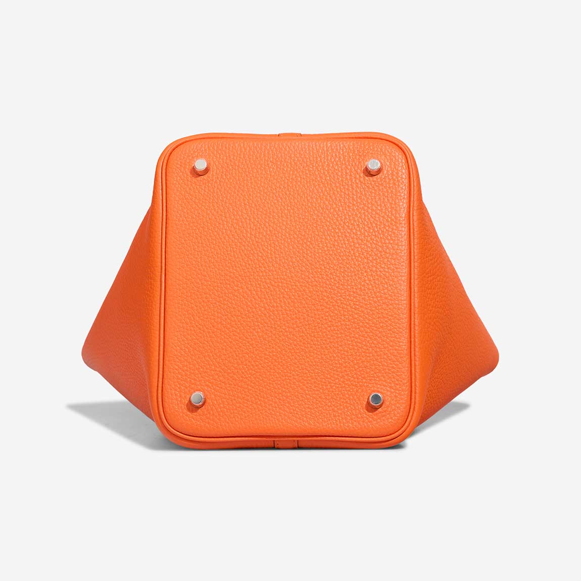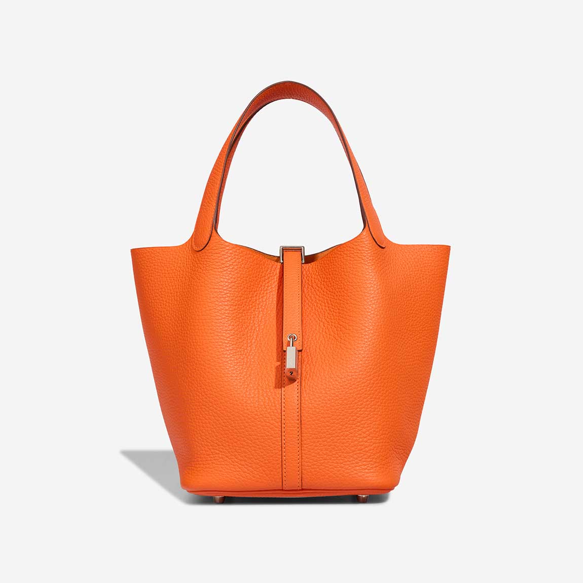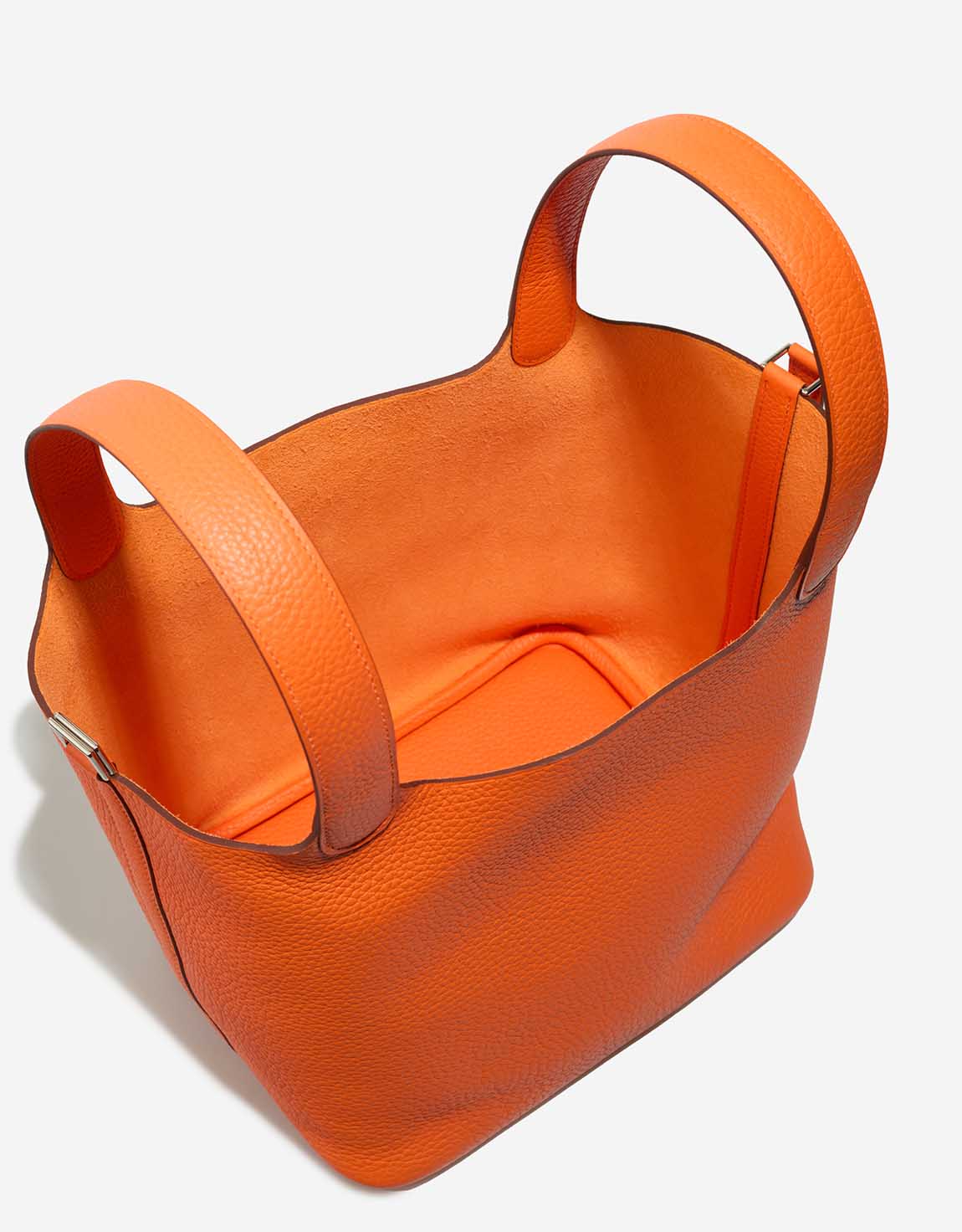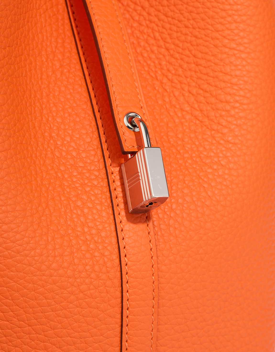 Bold and collectable, this Picotin 22 in Taurillon Clémence leather is rendered in Orange Minium — a saturated, striking shade from Hermès' seasonal palette. The grained leather lends a casual elegance, while the palladium hardware and padlock complete the design. Crafted in 2024 ("W" stamp), it arrives in immaculate unworn condition.