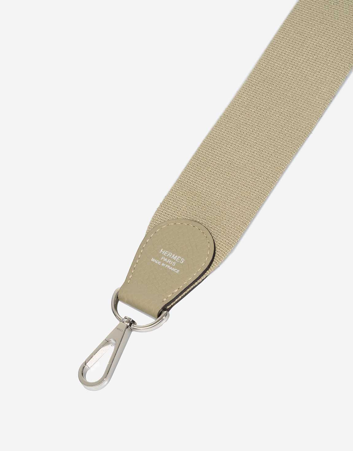 Designed for versatility, this Hermès shoulder strap pairs Togo leather and Toile in the earthy shade of Sauge. Finished with palladium hardware, the strap adds a refined and practical touch to your Hermès bags. It is in excellent pre-loved condition.